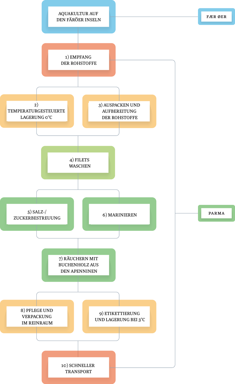 Da nur fangfrischer Fisch verwendet wird, der ausgenommen und auf eine konstante, kontrollierte Temperatur gebracht wird (also nicht gefroren ist), ist die Produktionskette nach strengen logistischen Regeln organisiert, um sicherzustellen, dass der Lachs schnell von den Meeren Nordeuropas nach Parma transportiert wird, wo er sofort nach seiner Ankunft mit der nötigen Sorgfalt verarbeitet wird. All dies wird durch einen schnellen Lieferservice garantiert, der mit einem internationalen Spediteur vereinbart wurde und es ermöglicht, dass das Produkt unter den besten Bedingungen transportiert wird und immer frisch und unversehrt an seinem Bestimmungsort ankommt.