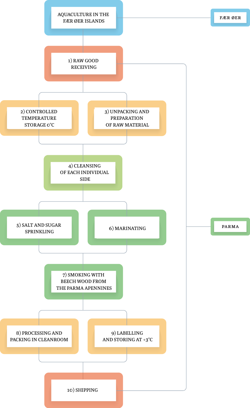 The processing in the new plants in Parma is carried out in a completely healthy environment, constantly sanitized and controlled by environmental analyses that are replicated consistently throughout the year. All processes are carried out by hand: unpacking and preparing the salmon to marinate and smoke; carefully selected by the best specimens, and with remote temperature control to certify the perfect conservation conditions.