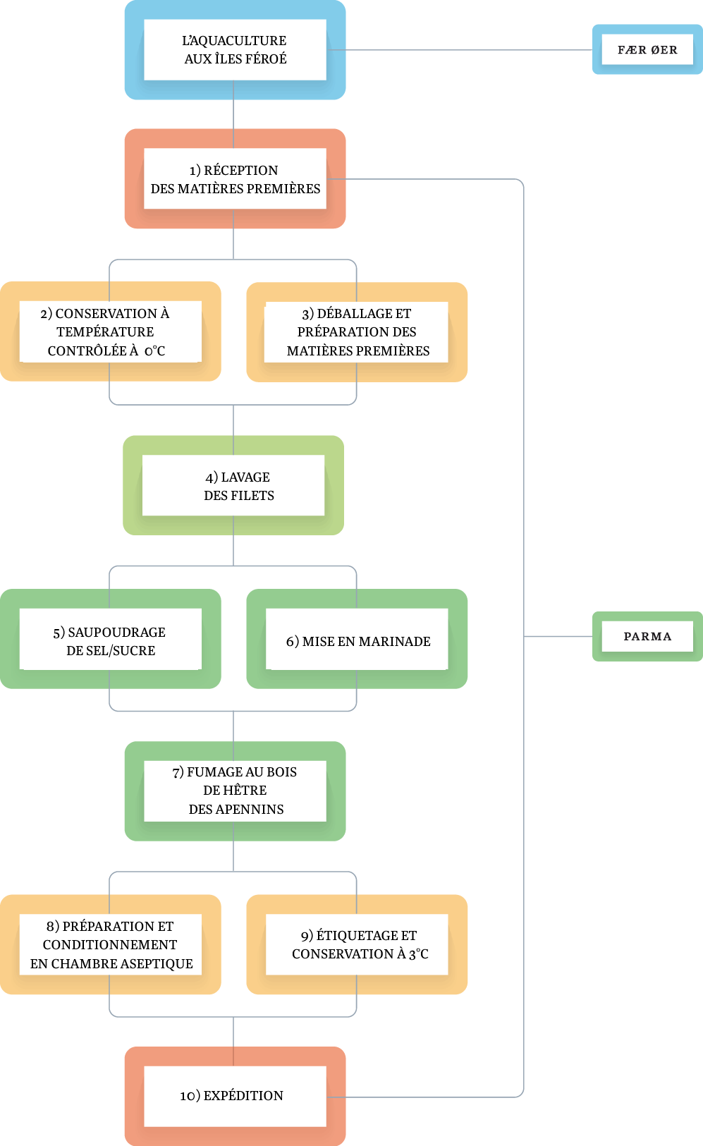Les opérations réalisées dans les nouvelles usines de Parme se déroulent dans des environnements rigoureusement sains, constamment nettoyés et contrôlés au moyen d’analyses environnementales en permanence, tout au long de l’année. Le déballage et la préparation des saumons en vue des procédés de mise en marinade et de fumage sont effectués à la main, l’occasion pour nous de sélectionner rigoureusement les plus beaux spécimens, tout en contrôlant à distance la température pour certifier de conditions de conservation parfaites.